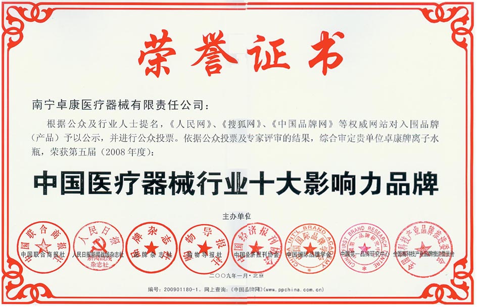 卓康牌離子水瓶榮獲中國名特優(yōu)品牌[點小圖見大圖] *榮獲中國醫(yī)療器械行業十大影響力品牌[點小圖見大圖]--------