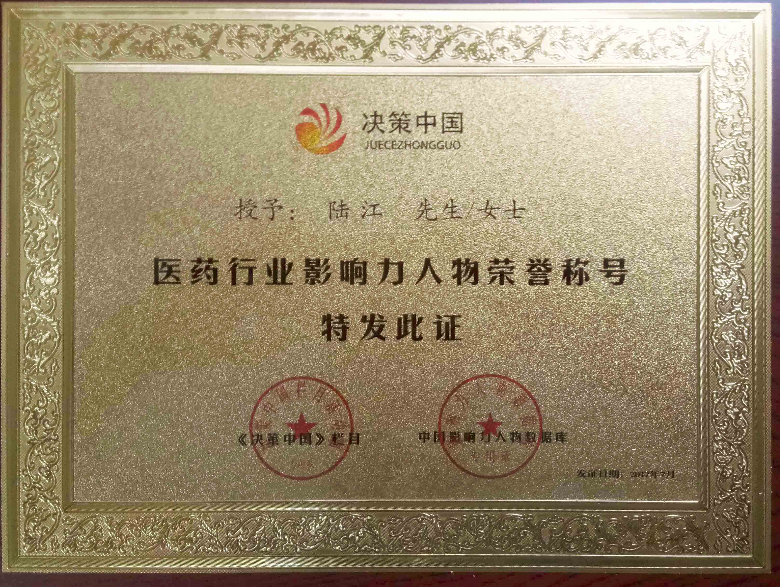 陸江榮獲醫(yī)藥行業影響人物證書